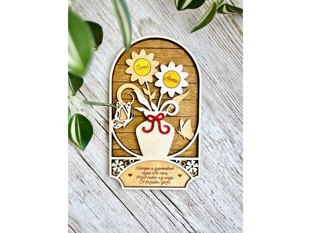 A 30×18 cm-es dekoráció egy csokor virágot ábrázol, ahol minden virág egy-egy nevet jelképezhet – így akár 1-től 6 névig teljes mértékben személyre szabható. Az alsó szövegmezőben egyedi üzenet, idézet vagy köszöntő is elhelyezhető, így még különlegesebbé téve az ajándékot.